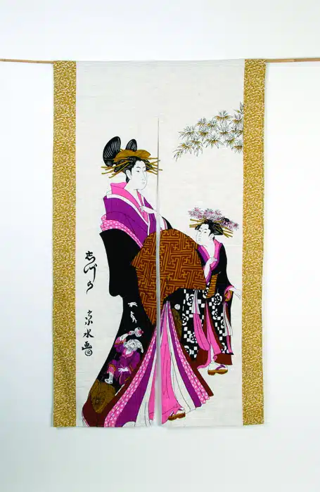 Baumwolle, Rayon Noren, japanischer Türvorhang, Geishas, fernöstlich, asiatische Dekoration, japanische Kultur, Interieur, Privatsphäre, Atmosphäre, Wärme, Eleganz, traditionell, The Oriental Shop, kaufen.