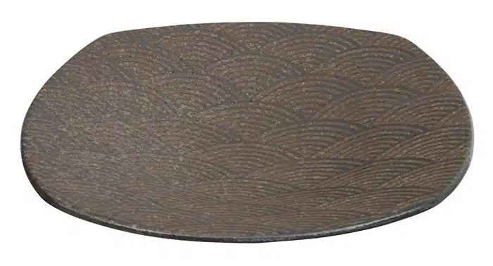 Brauner Teller, Mino Yaki Kollektion, Geschirr, eleganter Teller, 28 cm Durchmesser, Mahlzeiten servieren, Keramik, Langlebigkeit, fernöstliches Design, asiatische Kultur, Esstisch, traditionell, modern, dezentes Wellenmuster, The Oriental Shop, raffinierte Desserts, Hauptgericht, Tischgedeck.