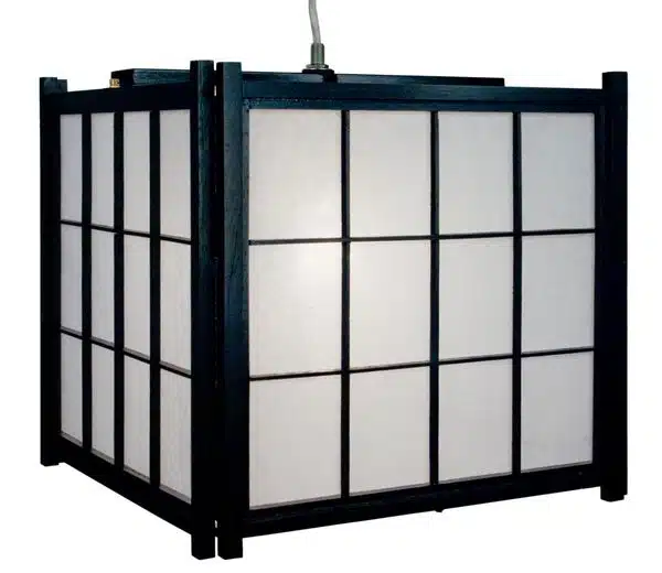 Pendelleuchte Japan, fernöstliche Eleganz, japanische Ästhetik, moderne Beleuchtung, schwarzer Holzrahmen, weiße Paneelen, diffuses Licht, warme Atmosphäre, kunstvolle Lampe, Esstisch, Wohnzimmer, fernöstlicher Akzent.