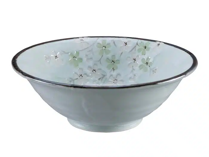 Reich verziert mit japanischen Blüten auf einem blassen Pastellton des Frühlingsgrüns, wird diese wundervolle Kollektion von Schalen, Tellern und Tassen die Atmosphäre Ihrer Küche verbessern.
