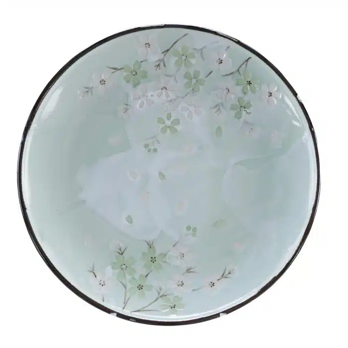 Reich verziert mit japanischen Blüten auf einem blassen Pastellton des Frühlingsgrüns, wird diese wundervolle Kollektion von Schalen, Tellern und Tassen die Atmosphäre Ihrer Küche verbessern.