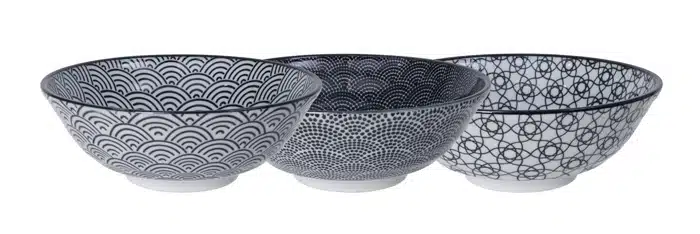 Nudelnschalen set schwarz – Wellen / Punkte / Streifen – Nippon Blue – 3 Stück – 21 × 7,8 cm