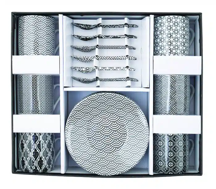 Die eleganten Formen, Dekorationen und das hochwertige Porzellan sind traditionell asiatisch, während das klare Schwarz-Weiß aus dem Minimalismus des zeitgenössischen skandinavischen Designs stammt.