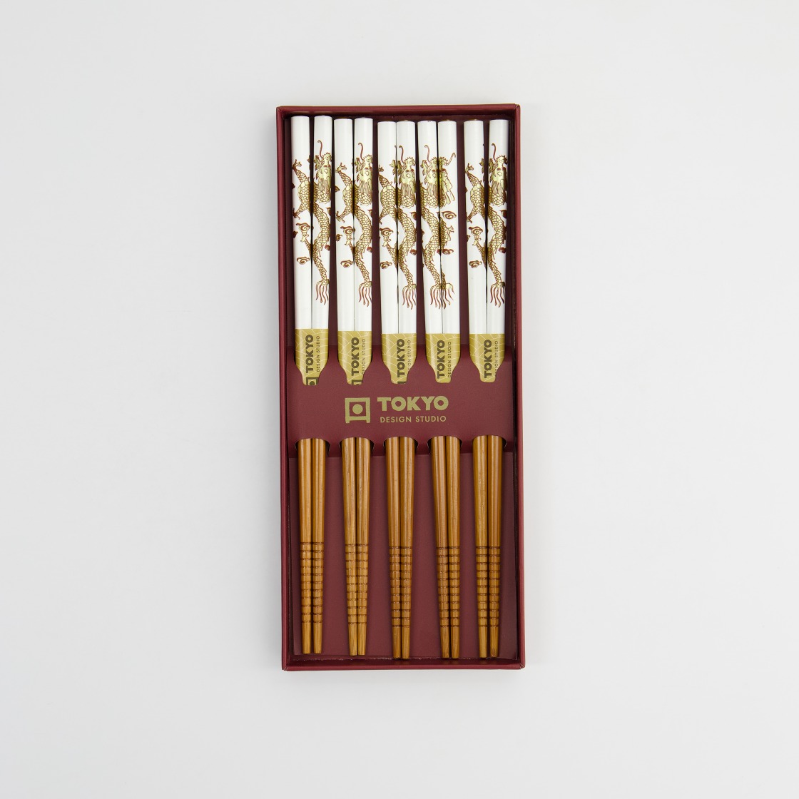 Deze prachtige chopstick giftset van Tokyo Design Studio bestaat uit vijf paar hoogwaardige eetstokjes, elk met een elegant Rode Draak-ontwerp. De combinatie van traditioneel Japans design en moderne afwerking maakt deze set perfect voor dagelijks gebruik of als stijlvol geschenk. Ideaal voor liefhebbers van de Aziatische keuken en design.