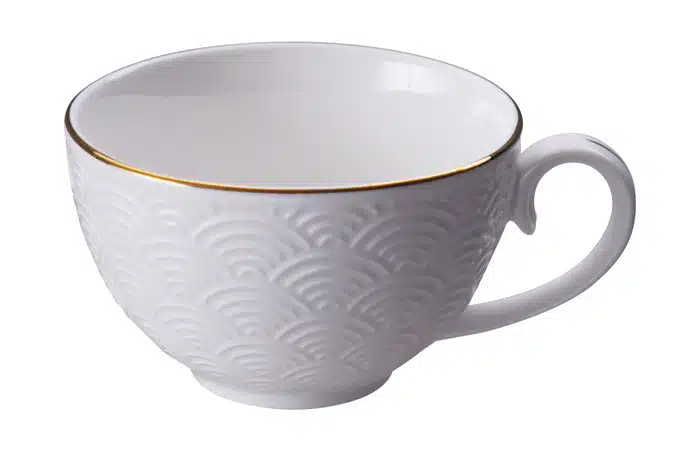 Nippon White, Kaffeetasse, Porzellan, goldener Rand, Wellenmuster, Geschirr, Frühstücksset, Essservice, Tischdekoration.