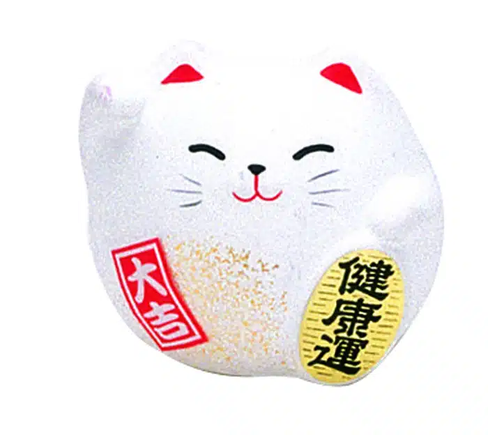 Hergestellt aus hochwertigem Material, strahlt diese weiße Glückskatze mit ihrem freundlichen Lächeln und erhobenen Pfötchen eine einladende Atmosphäre aus.