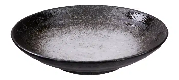 Der subtile Farbverlauf von Weiß zu dunklen Rändern verleiht diesem Geschirrstück ein einzigartiges Aussehen, das sowohl rustikal als auch raffiniert ist.
