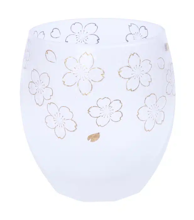 Japanisches Sake-Set, weißes Glas, Sakura-Motiv, 345 ml Fassungsvermögen, Tischdekoration, japanische Kultur, Sakegläser, Blütendesign, hochwertiges Glas, The Oriental Shop, japanische Eleganz, Heimabendessen, japanische Trinkkultur.